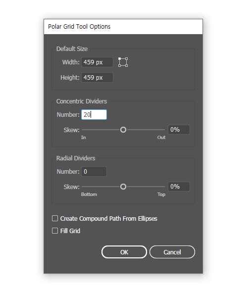 옵션창에서 Concentric Dividers에는 원하시는 동그라미의 개수를 입력하고, Radiarl Dividers 항목에는 0으로 입력해주세요.