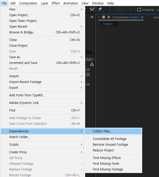 에프터이펙트에서 Collect Files을 통해 간단히 현재 작업에 쓰인 모든 소스파일(footage)를 포함하여 저장할 수 있습니다.