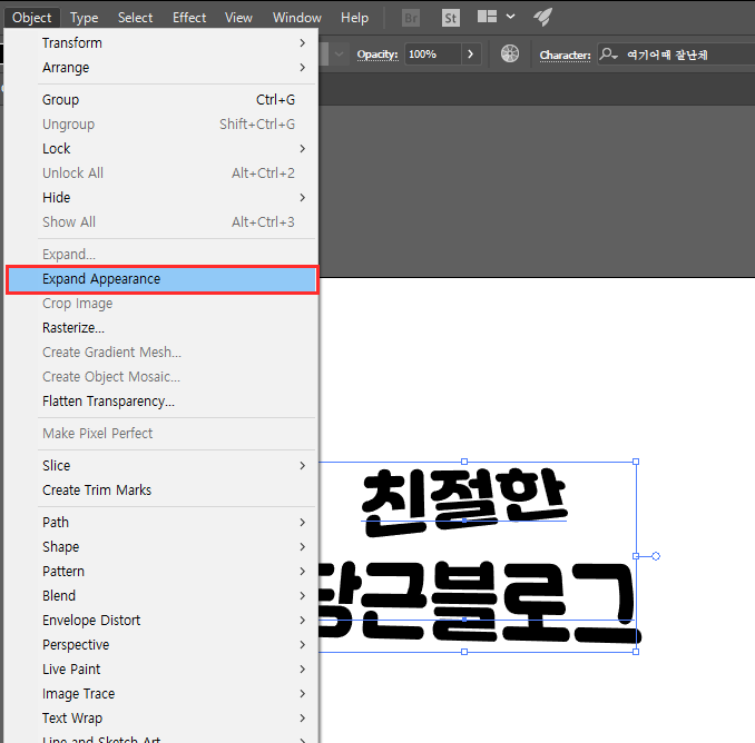 Object - Expand Appearance를 선택하세요. 그러면 텍스트 속성도 사라지고 왜곡된 그대로 한 오브젝트가 된 것을 보실 수 있어요.