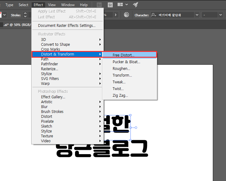변형할 텍스트를 선택하시고 Effect - Distort & Transform - Free Distort를 클릭합니다.