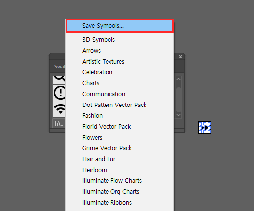 심볼 패널에서 책 모양 아이콘을 누르시고 Save Symbols을 선택합니다.