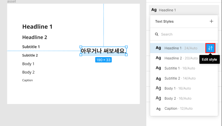 그리고 텍스트 스타일을 원하시는걸로 지정합니다. 저는 Headline 1로 지정해볼게요.