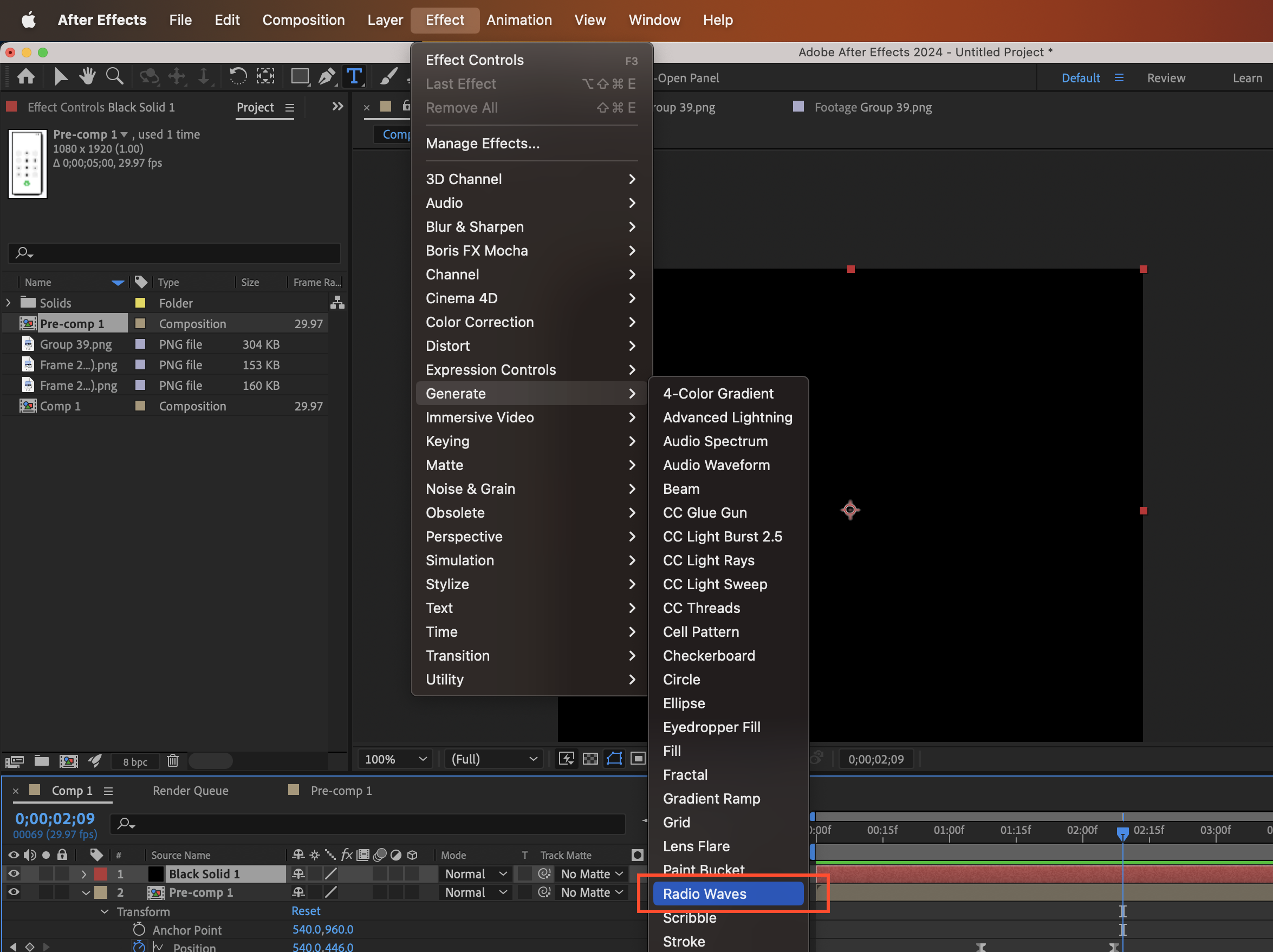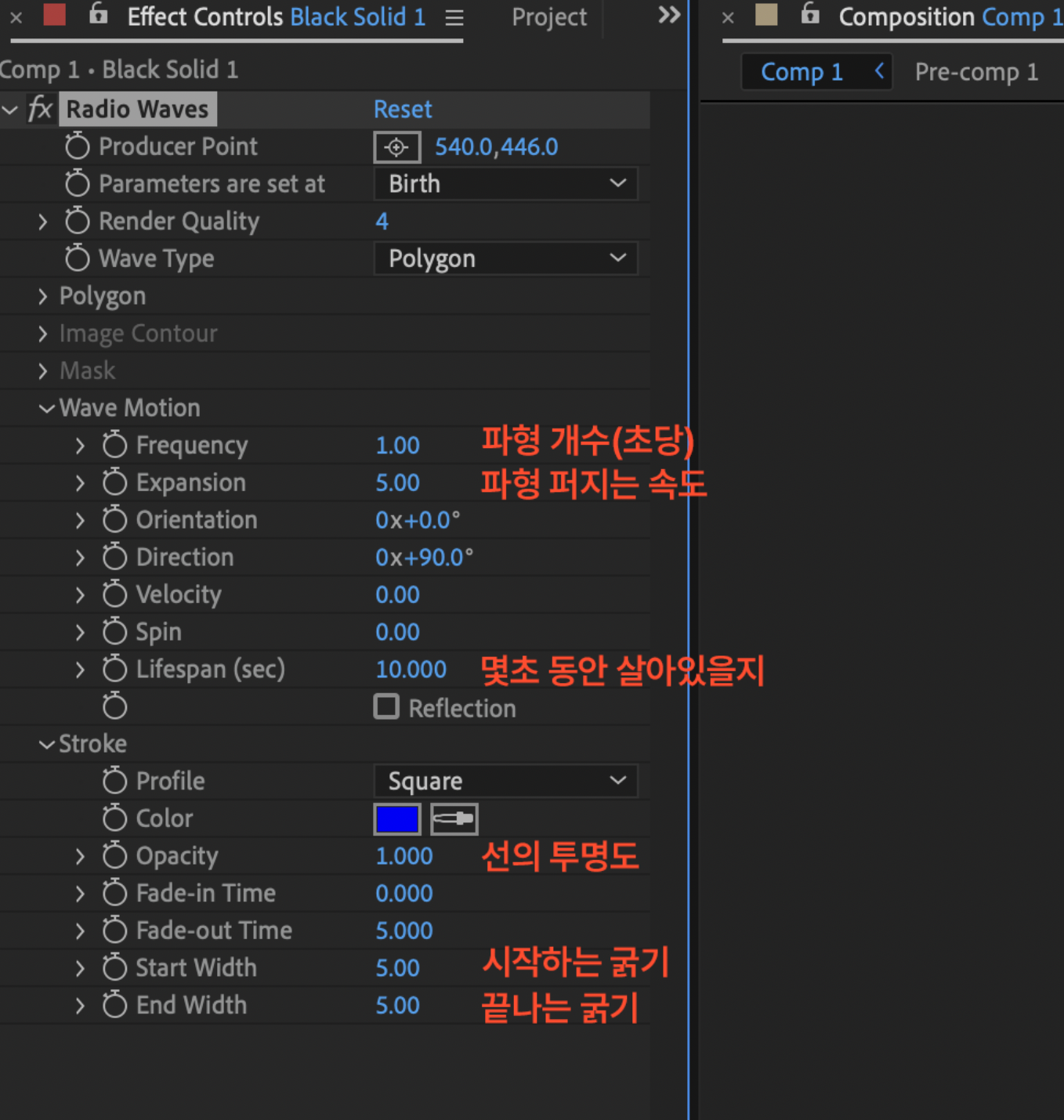❗️주의 : 이렇게 애프터이펙트에서 솔리드에 넣는 효과는 로티에서는 구현이 안되는 것 같아요. (검은 배경이 나오는 등)