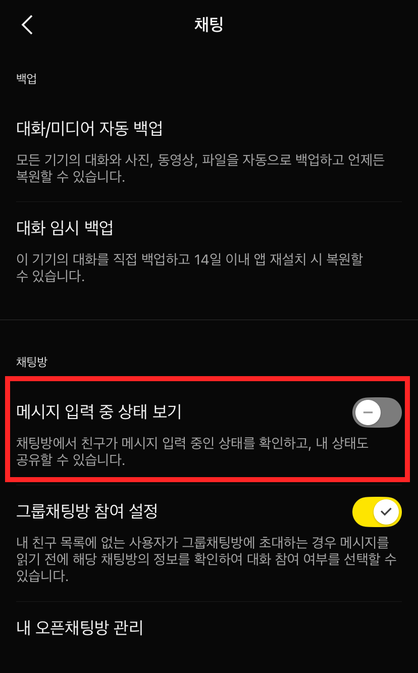 채팅방 항목에 메시지 입력 중 상태 보기 라는 항목이 보이시죠? 이걸 꺼주시면 됩니다.