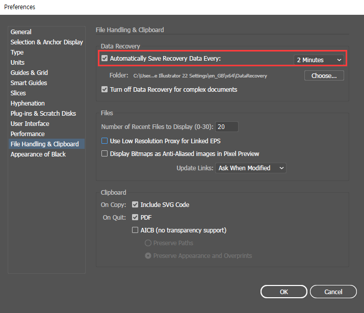 데이터 리커버리 설정해두면 컴퓨터가 갑자기 꺼지거나 일러스트레이터가 갑자기 꺼졌을 때 저장된 복구용 데이터를 불러옵니다. 일종의 안전장치로 설정해두시면 좋을 것 같아요.