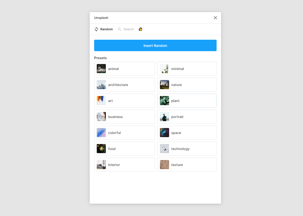 플러그인 UI입니다. 크게 Random탭과 Search탭이 있어요.