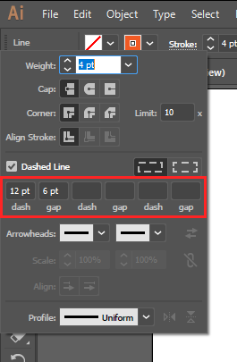 여기서 Dash와 gap은 점선을 이루는 선의 길이와 그 선간의 간격을 의미합니다.