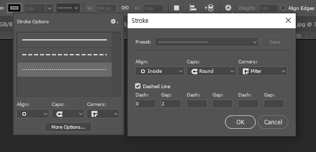 포토샵에서는 선을 그릴 때 간단히 점선으로 설정할 수 있는 박스가 바로 붙어있지만 옵션창에서 more options를 클릭하면 동일하게 Dash와 갭을 지정할 수 있어요.
