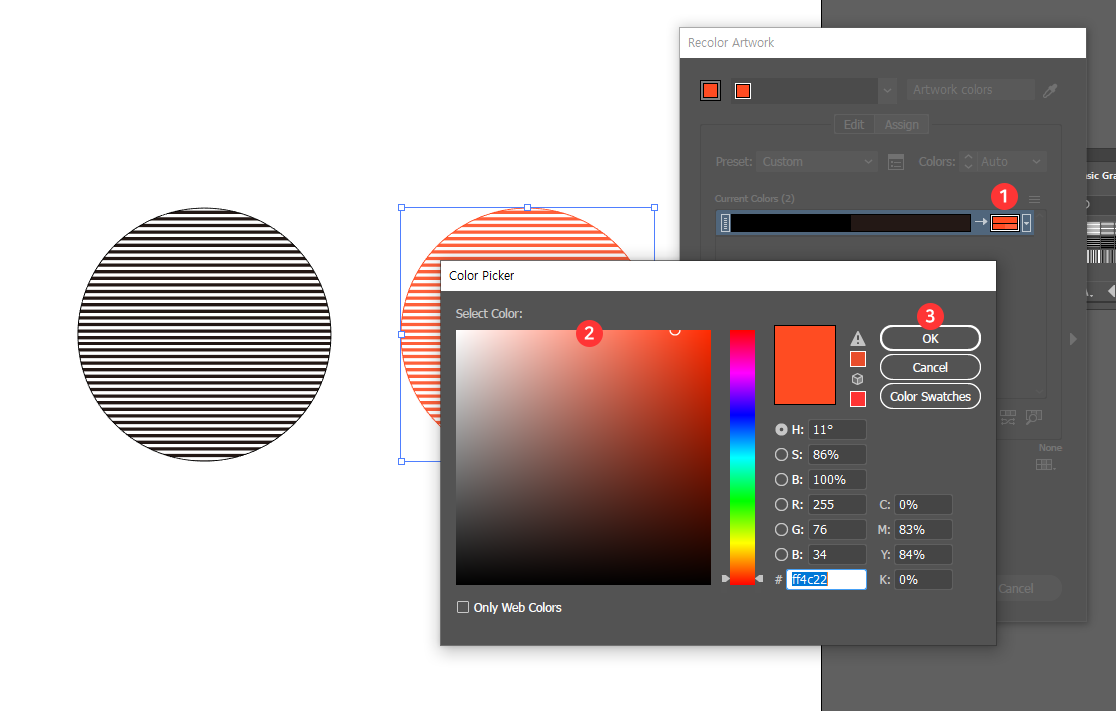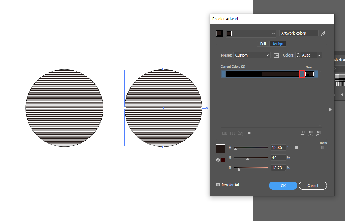 패턴 색을 바꿀 오브젝트를 선택하시고 상단 바에 있는 Recolor Artwork를 누르시거나