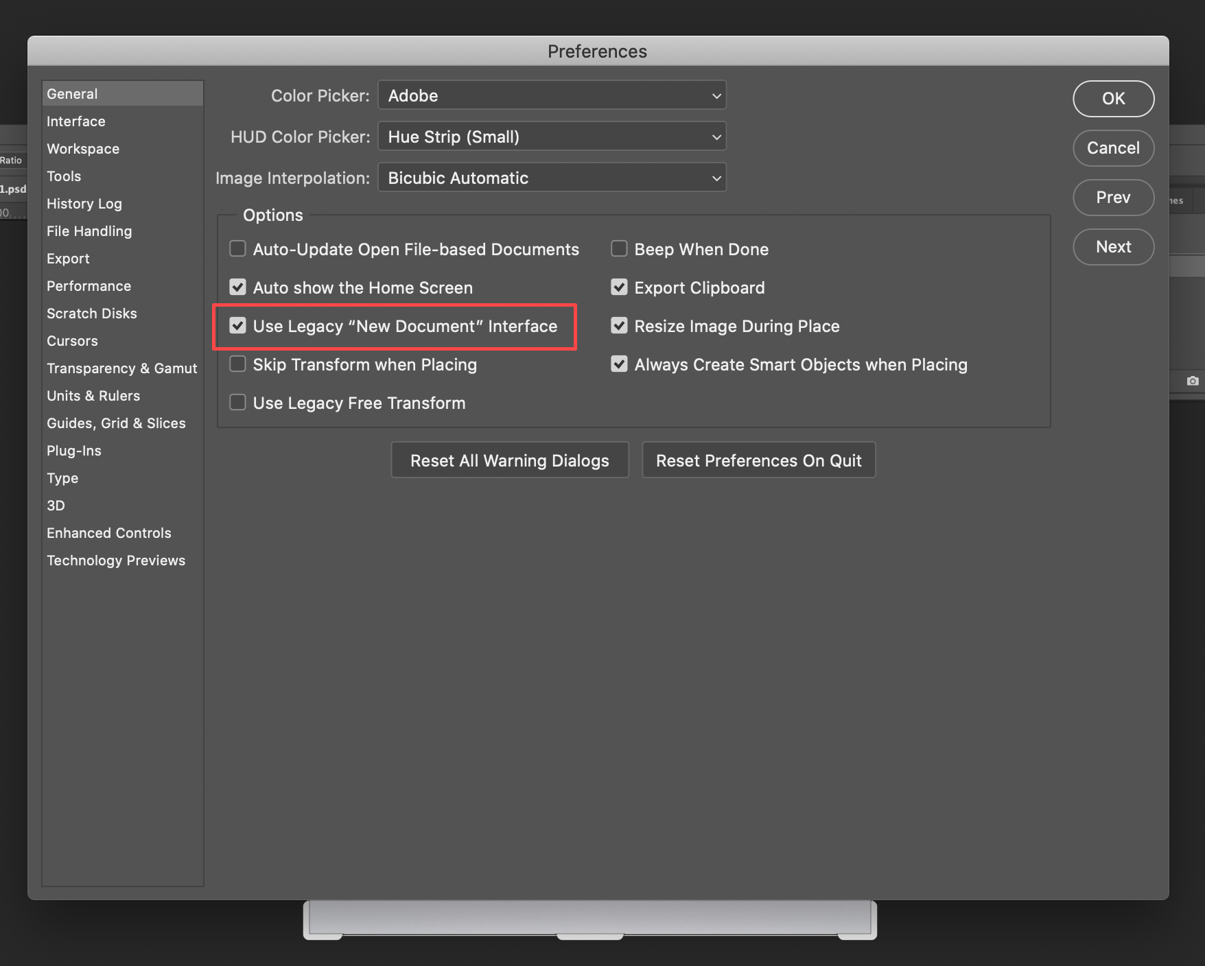 그리고 나서 Use Legacy “New Document” Interface 부분에 체크가 해제되어있을 거예요. 이걸 체크해줍니다. OK눌러서 설정 창 닫아주시고요.
