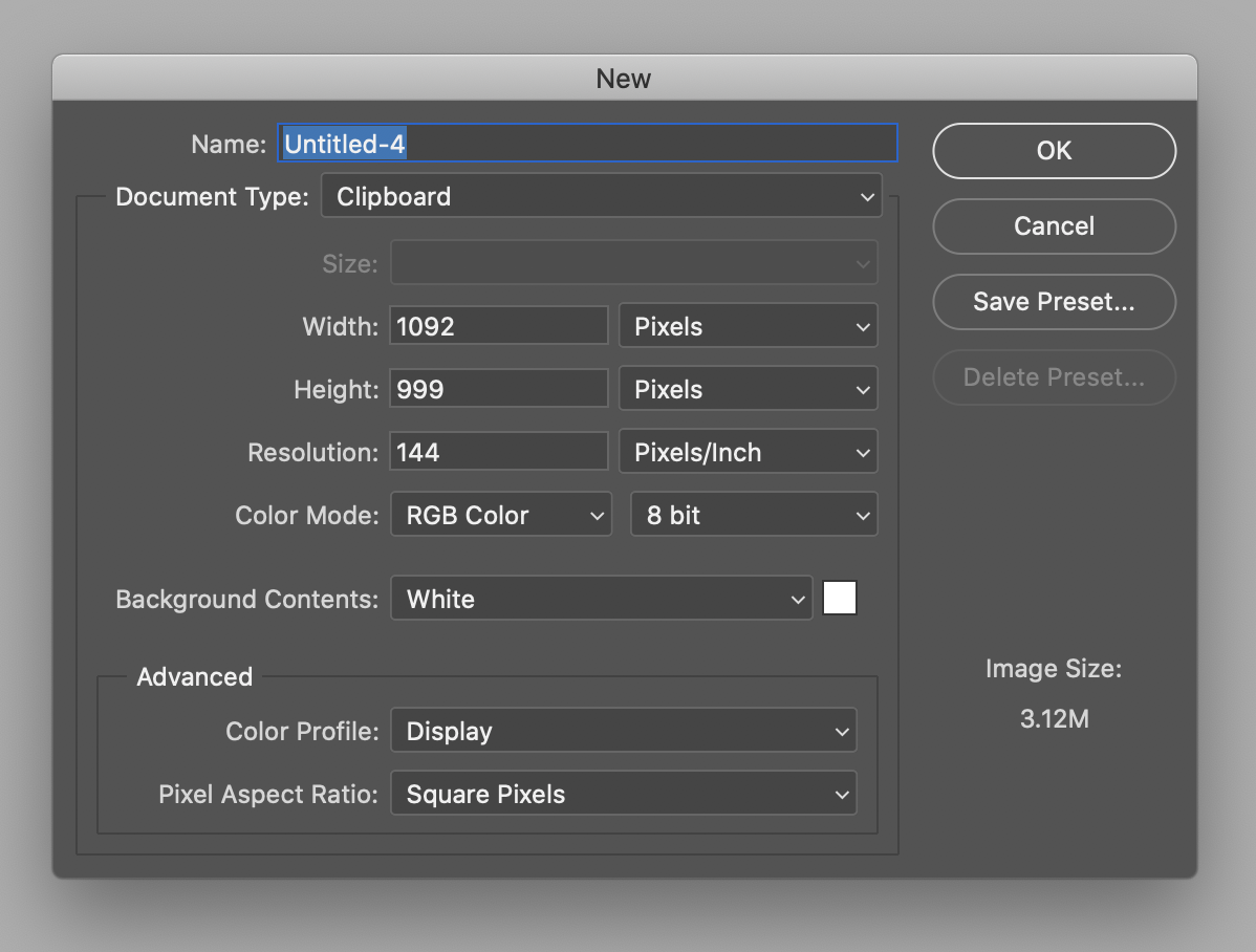 이렇게 익숙한 new file 창이 뜨면서 정상적으로 새 도큐먼트를 생성하실 수 있어요.