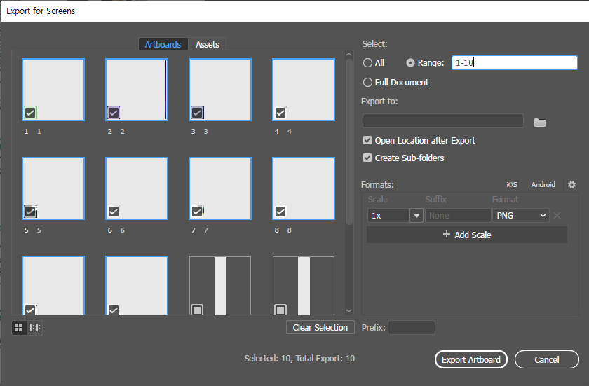 또 이렇게 순서를 정리해두면 Export for screen에서 페이지 Range를 선택할 때도 편리합니다.